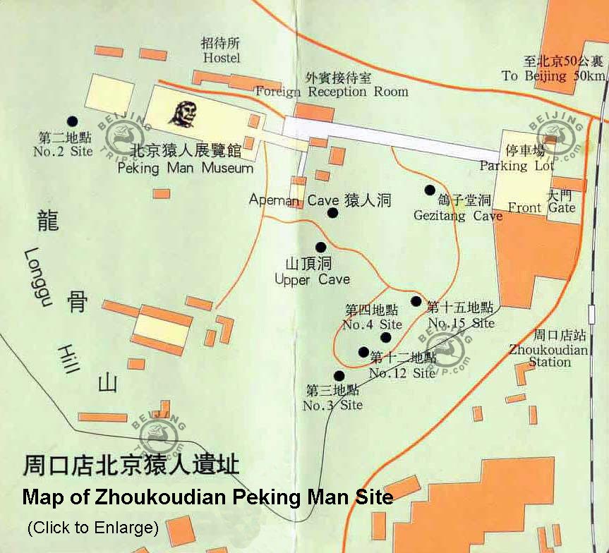 The Peking Man Site is located at Longgu Hill, Zhoukoudian, Fangshan District, approximately 50 kilometers southwest of Beijing's downtown area. This early human site has been shown to be the richest and most comprehensive site representing the early stages of the Paleolithic Age. In 1987, the site was entered onto the World Heritage List without an application.